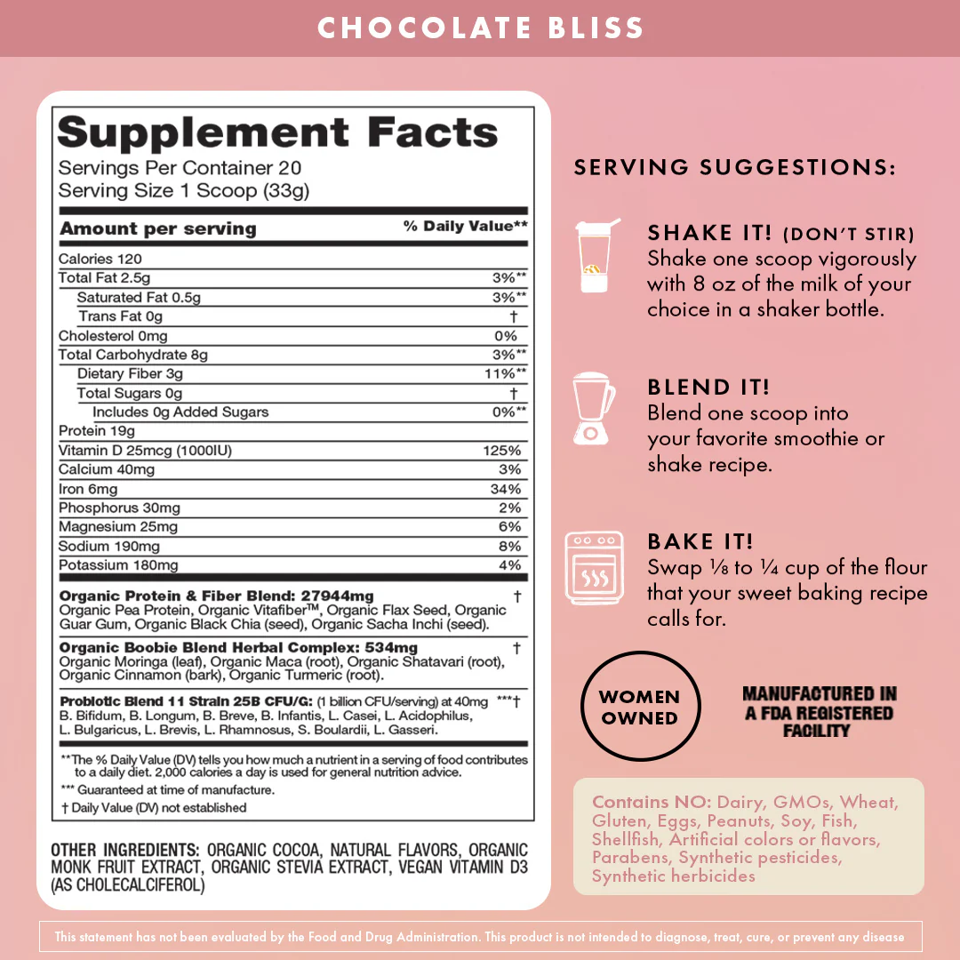 Organic Protein & Fiber Blend: Pea Protein*, Vitafiber™*, Flax Seed*, Guar Gum*, Chia*, Sacha Inchi*. Organic Herbal Complex: Moringa*, Maca Root*, Shatavari*, Cinnamon*, Turmeric*. Probiotic Blend: B. Bifidum, B. Longum, B. Breve, B. Infantis, L. Casei, L. Acidophilus, L. Bulgaricus, L. Brevis, L. Rhamnosus, S. Boulardii, L. Gasseri. Other Ingredients: Cocoa*, Natural Chocolate Flavor, Monk Fruit Extract*, Stevia Extract*, Vitamin D3 (Vegan). *Organic