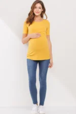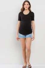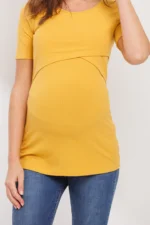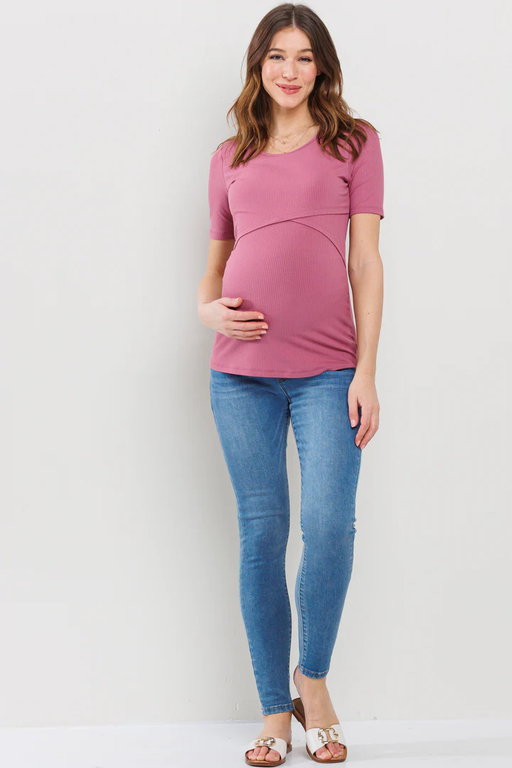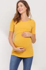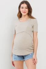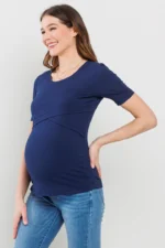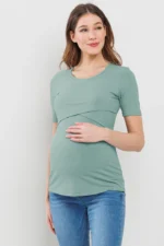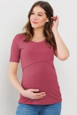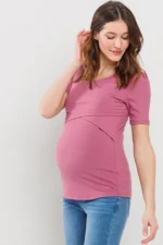 Made from a soft, stretchy 91% rayon and 9% spandex blend, this short-sleeve maternity and nursing top features a double-layer front for discreet nursing access. Comfortable and versatile for pregnancy, postpartum, and beyond. Machine washable; 27″ length (Small).