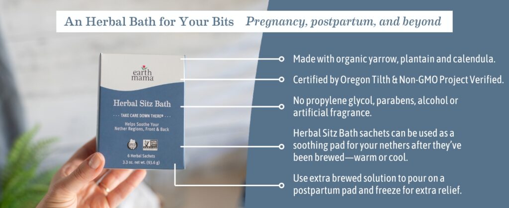 Herbal Sitz Bath sachets can be used as a soothing pad for your nethers after they’ve been brewed–warm or cool. Also, use the extra brewed solution to pour on a postpartum pad and freeze for extra relief.