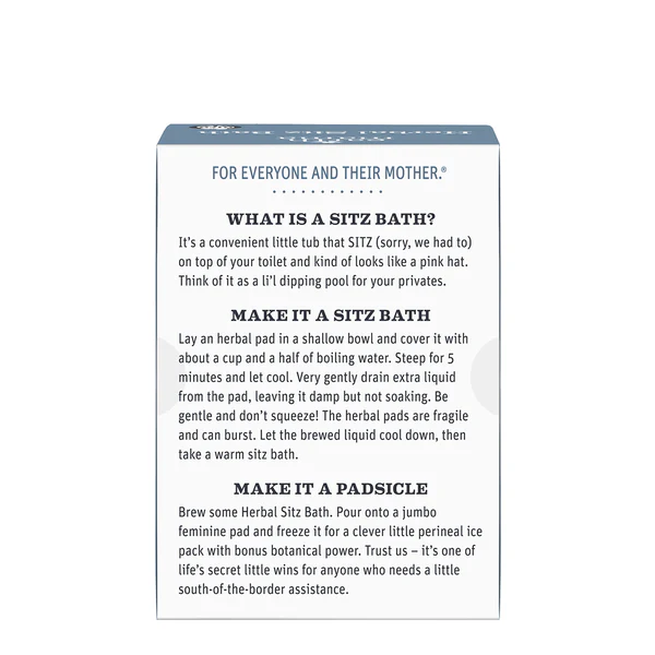 It’s made with a unique blend of organic herbs, oatmeal and salt that’s traditionally used to help provide “down there” comfort for anyone who needs it, including during pregnancy and postpartum. Each box contains six individual easy-to-use sachets to brew and cool, then use as a sitz bath anytime your basement level needs a little TLC.
