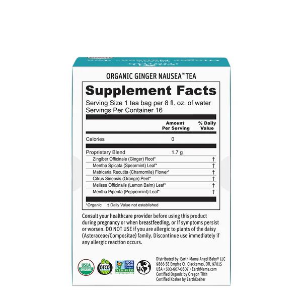 • USDA CERTIFIED ORGANIC: Earth Mama’s Organic Ginger Nausea Tea is a comforting ginger-minty blend of organic herbs traditionally used to help with occasional morning sickness and pregnancy nausea.