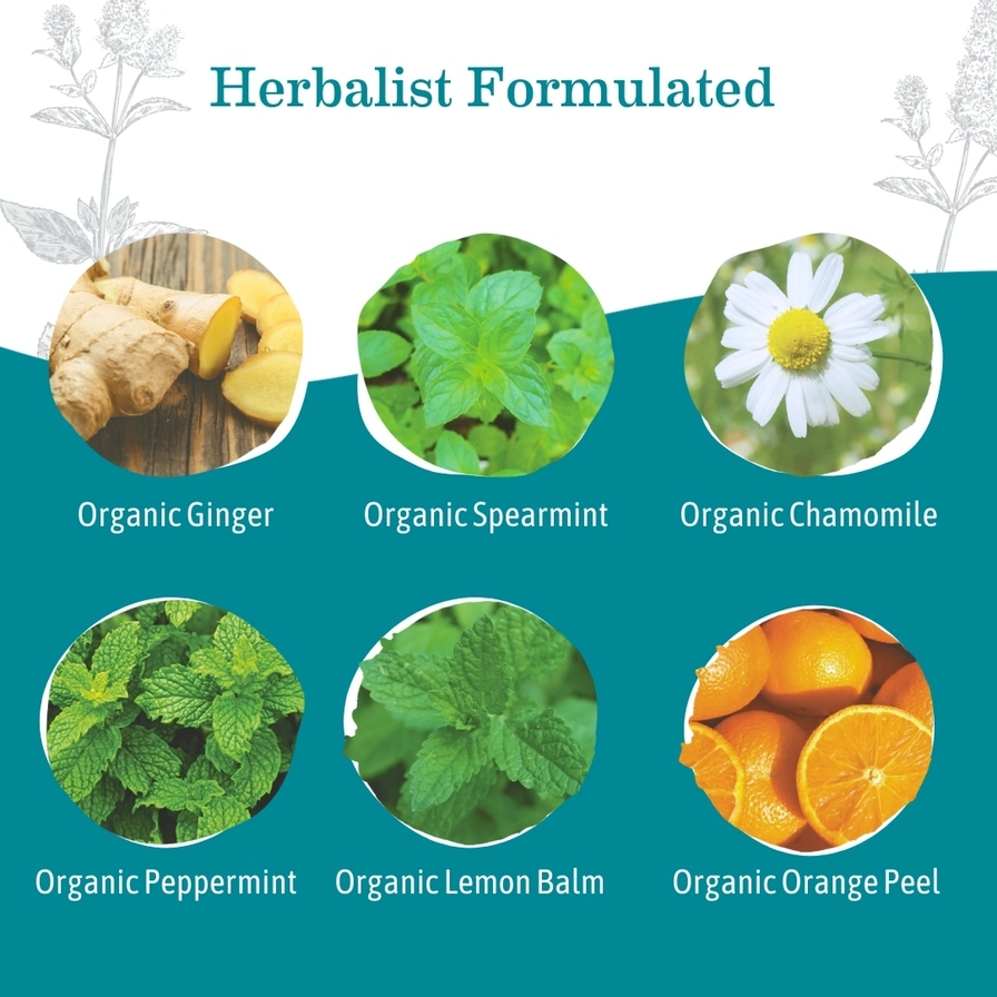 • SETTLE YOUR STOMACH: Organic ginger root joins forces with chamomile, lemon balm, a hint of mint and a twist of orange to help ease the quease.