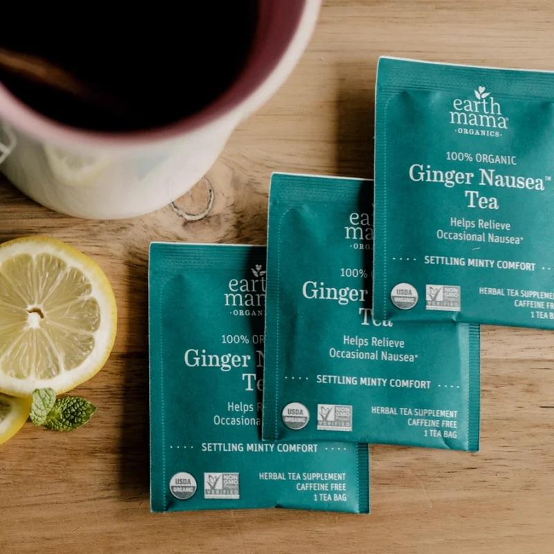Earth Mama’s Organic Ginger Nausea Tea, a comforting ginger-minty blend of organic herbs traditionally used to help with occasional morning sickness and pregnancy nausea in the morning (or all day long). This organic herbal tea is formulated with settling ginger root, chamomile and lemon balm, a hint of mint and a twist of orange peel for a citrus pop of flavor.