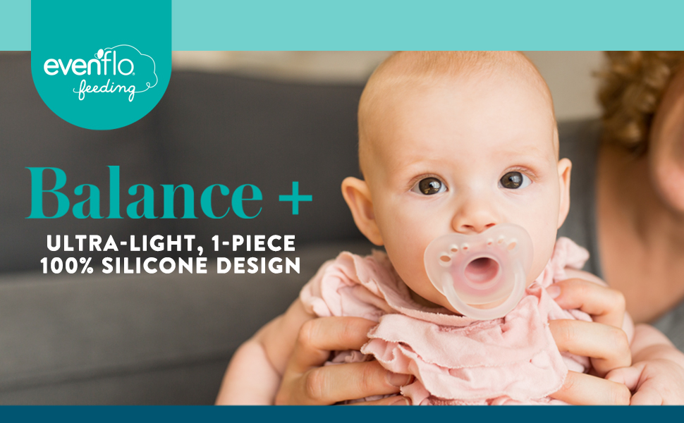 Developed with Pediatric Feeding Specialists, Evenflo Feeding Balance + Pacifiers are made with 100%, ultra-soft silicone. These 1-piece pacifiers are ultra-lightweight and flexible, helping to decrease mouth fatigue. The integrated vent holes helps keep skin dry, while the easy-grip handle makes it convenient for both you and your baby to hold. The Balance + Pacifier is available in Cylindrical (0-6 months) or Orthodontic (6 months +). Evenflo pacifiers are 100% free of BPA, polycarbonates, PVC and phthalates, and are also made of FDA-approved food grade material.