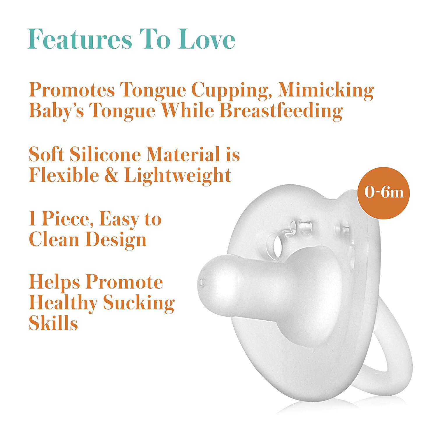 SUPPORTS BREASTFEEDING – The shape of your nipple and areola changes when your baby latches on to your breast Your baby’s tongue cups around the nipple For the 0-6 month baby, the cylindrical shape pacifier allows for the baby to mimic the tongue shape they make while breastfeeding