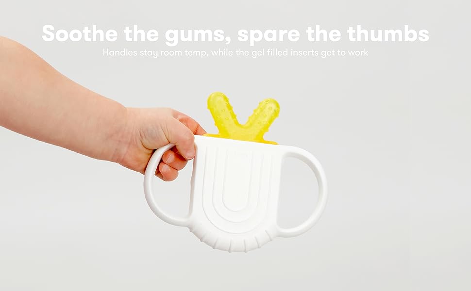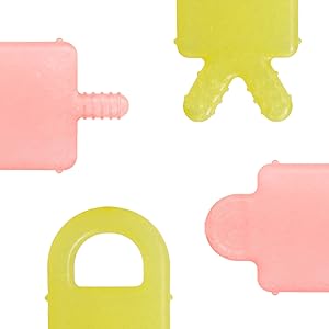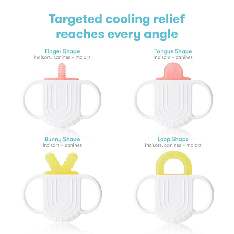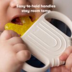 Skip the chilly teething rings and help baby’s gums without getting frostbite on their hands. The Not-Too-Cold-To-Hold Teether has a stay-warm handle for baby to hold, with two double-sided, chillable gum massagers made of BPA-free silicone. Each of the four sides is designed with shapes and textures for baby’s chomping pleasure while stimulating gums in the front + back.