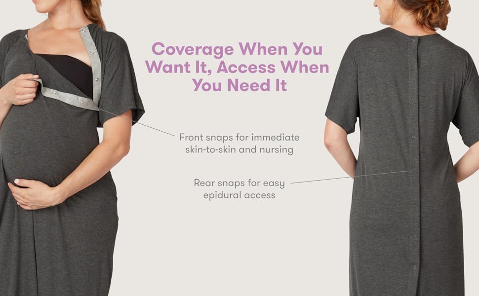 The softness of your favorite t-shirt with quick-access snaps for skin-to-skin and nursing, and a rear closure that won’t leave you flapping in the wind when doing laps around the hospital. Designed to look (with pockets!) and feel better, from the first contractions to the first pictures, and walking around with it under your robe. We’ve got you covered, front and back.