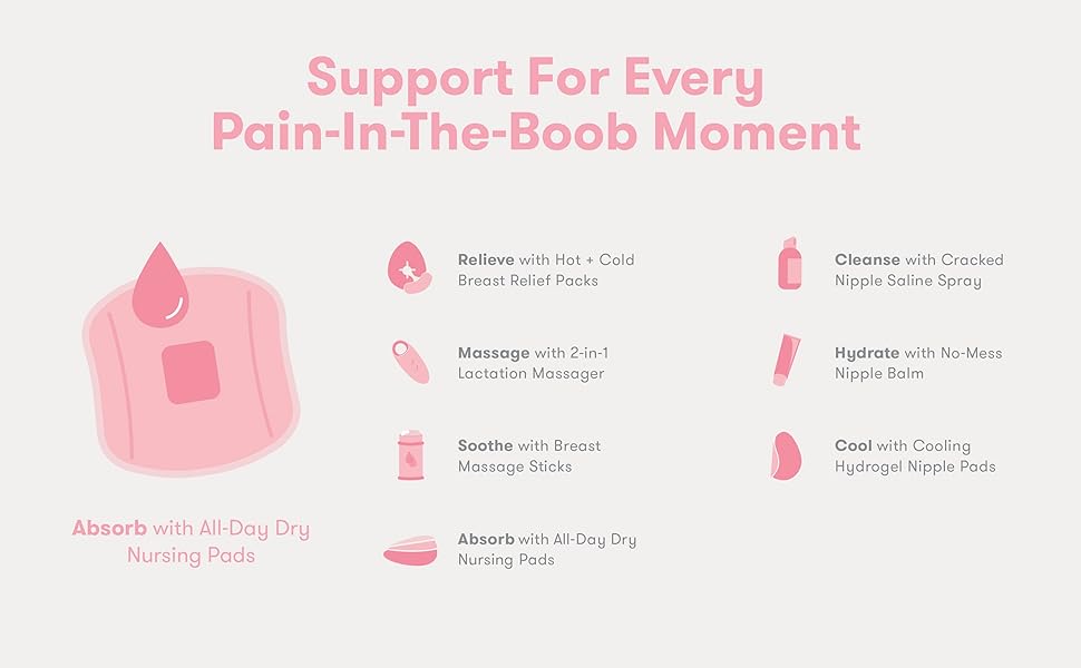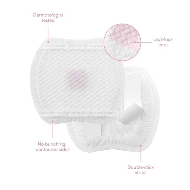 Skip the soggy shirt and get leak-proof confidence for up to 8 hours with these disposable nursing pads. A leak-lock core quickly absorbs and disperses milk to keep your nipples feeling dry, a contoured, discreet fit + double stick strips keep pads in place to prevent frustrating bunching, and they’re dermatologist tested for sensitive skin to keep breastfeeding moms comfortable.