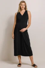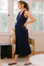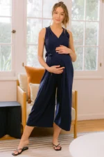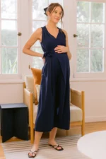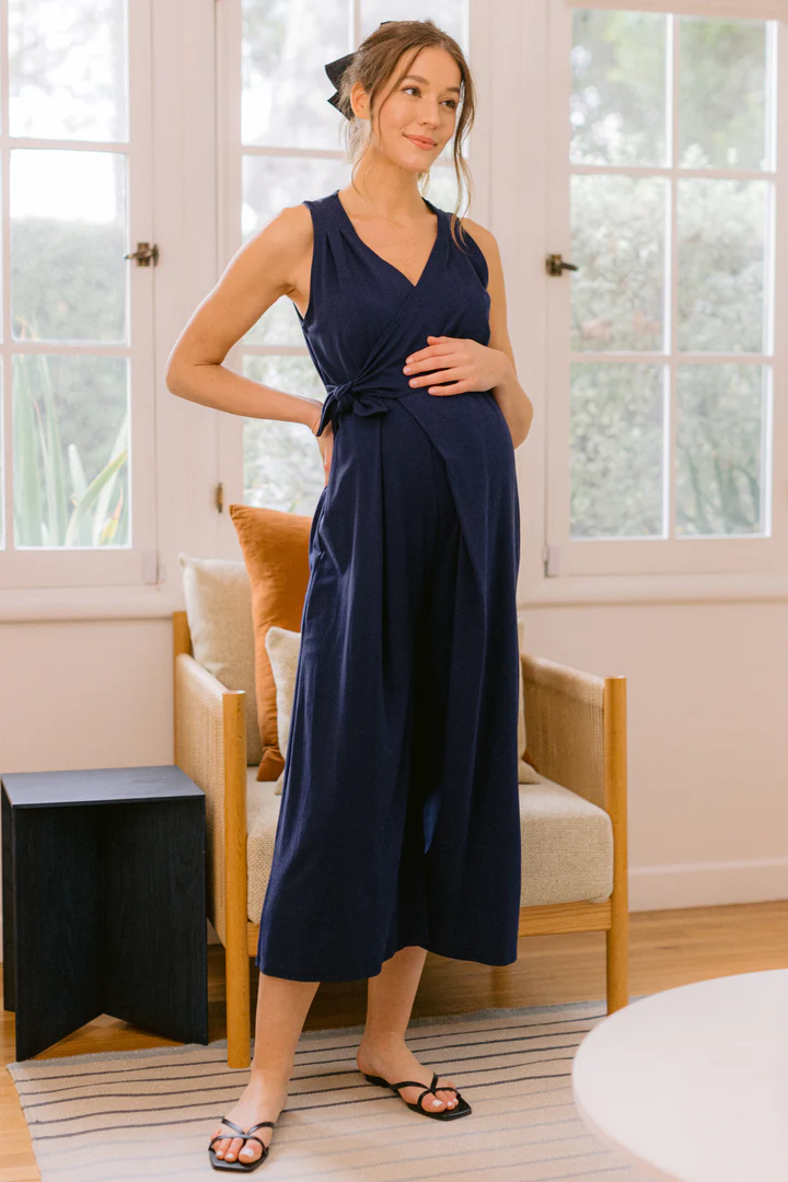 Made from a soft, breathable stretch blend, this sleeveless maternity jumpsuit features a flattering wrap neckline for discreet nursing access and a flowy flared silhouette. Designed to grow with your body, it offers all-day comfort and effortless style from pregnancy through postpartum.