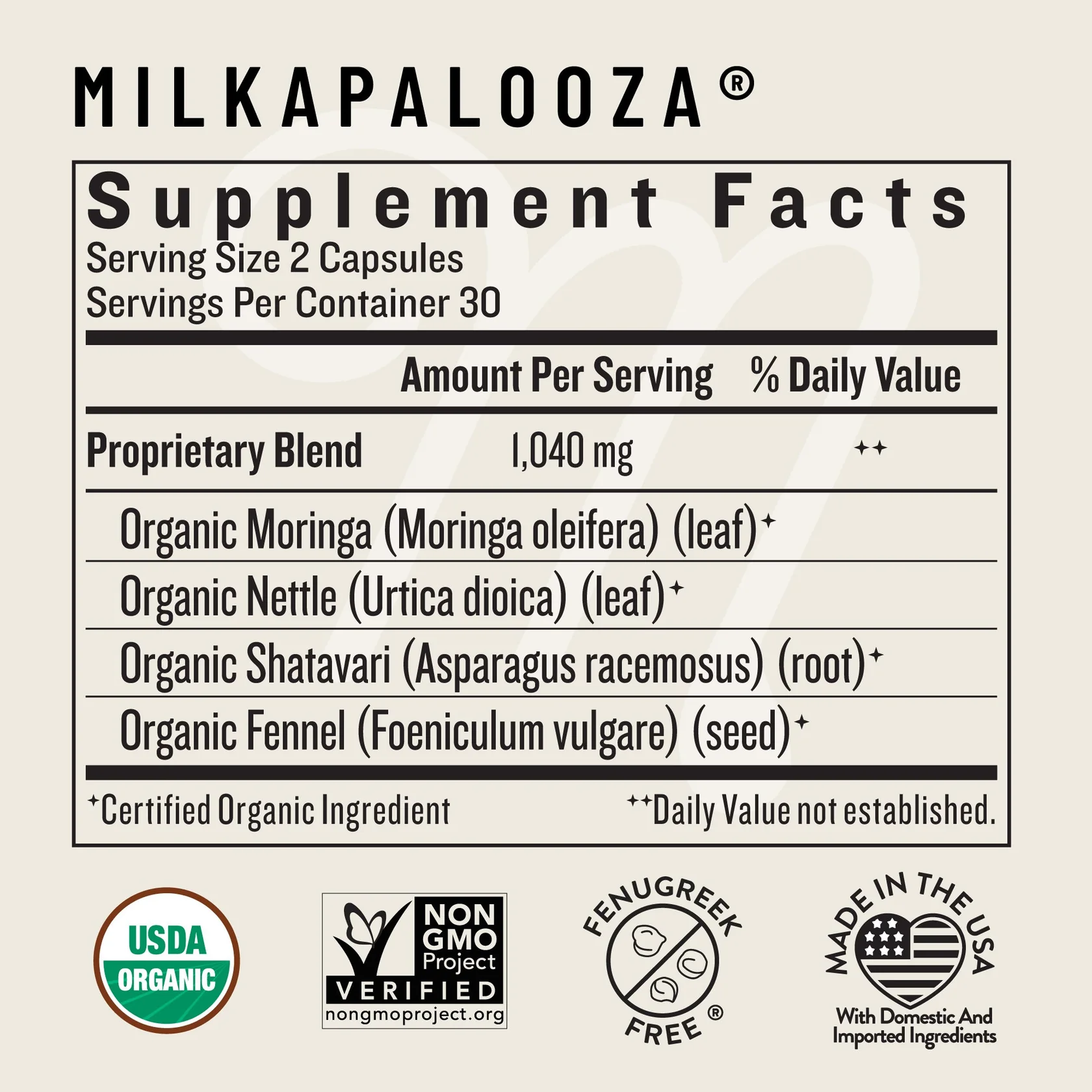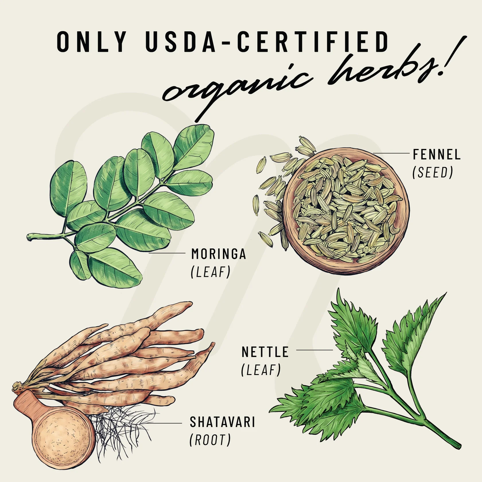 Organic moringa (leaf), organic nettle (leaf), organic fennel (seed), organic shatavari (root), organic vegetable capsule.