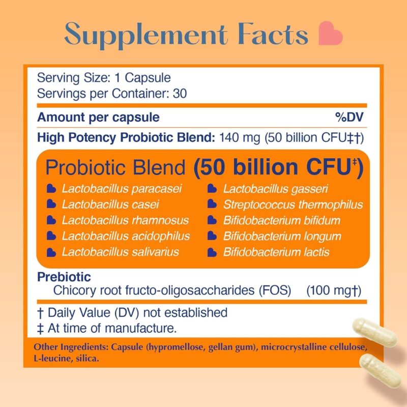 Probiotic Blend 140mg (Lactobacillus paracasei, lactobacillus casei, lactobacillus rhamnosus, lactobacillus acidophilus, lactobacillus gasseri, streptococcus thermophilus, bifidobacterium bifidum, bifidobacterium longum, bifidobacterium lactis), chicory root fructo-oligosaccarides, Capsule (hypromellose, gella gum) microcrystalline cellulose, L-leucine, silica.
