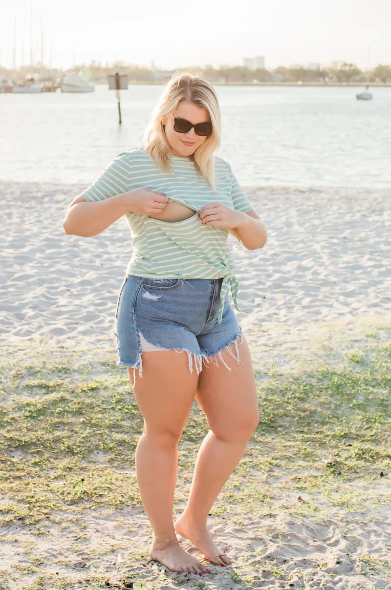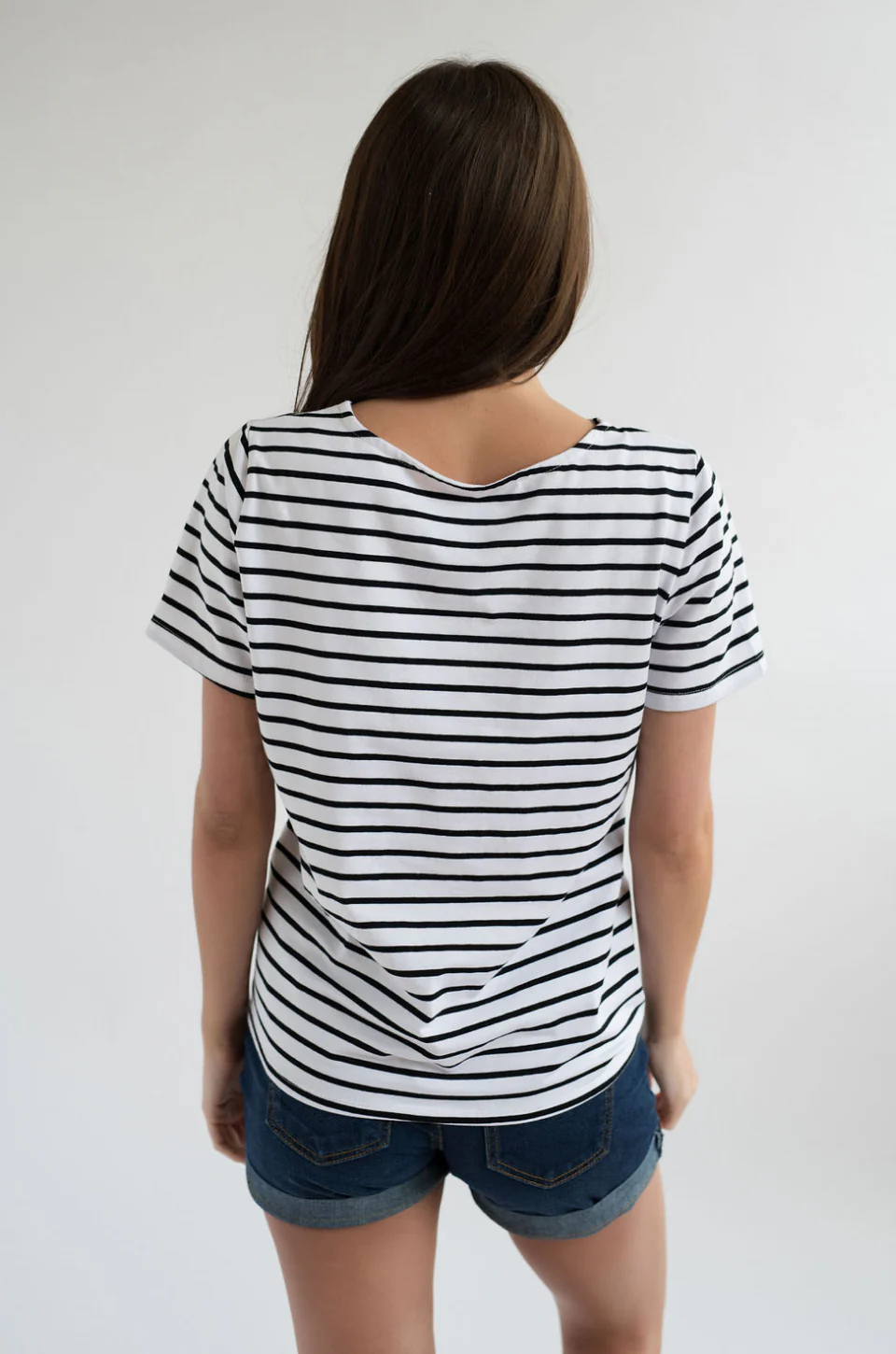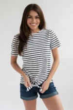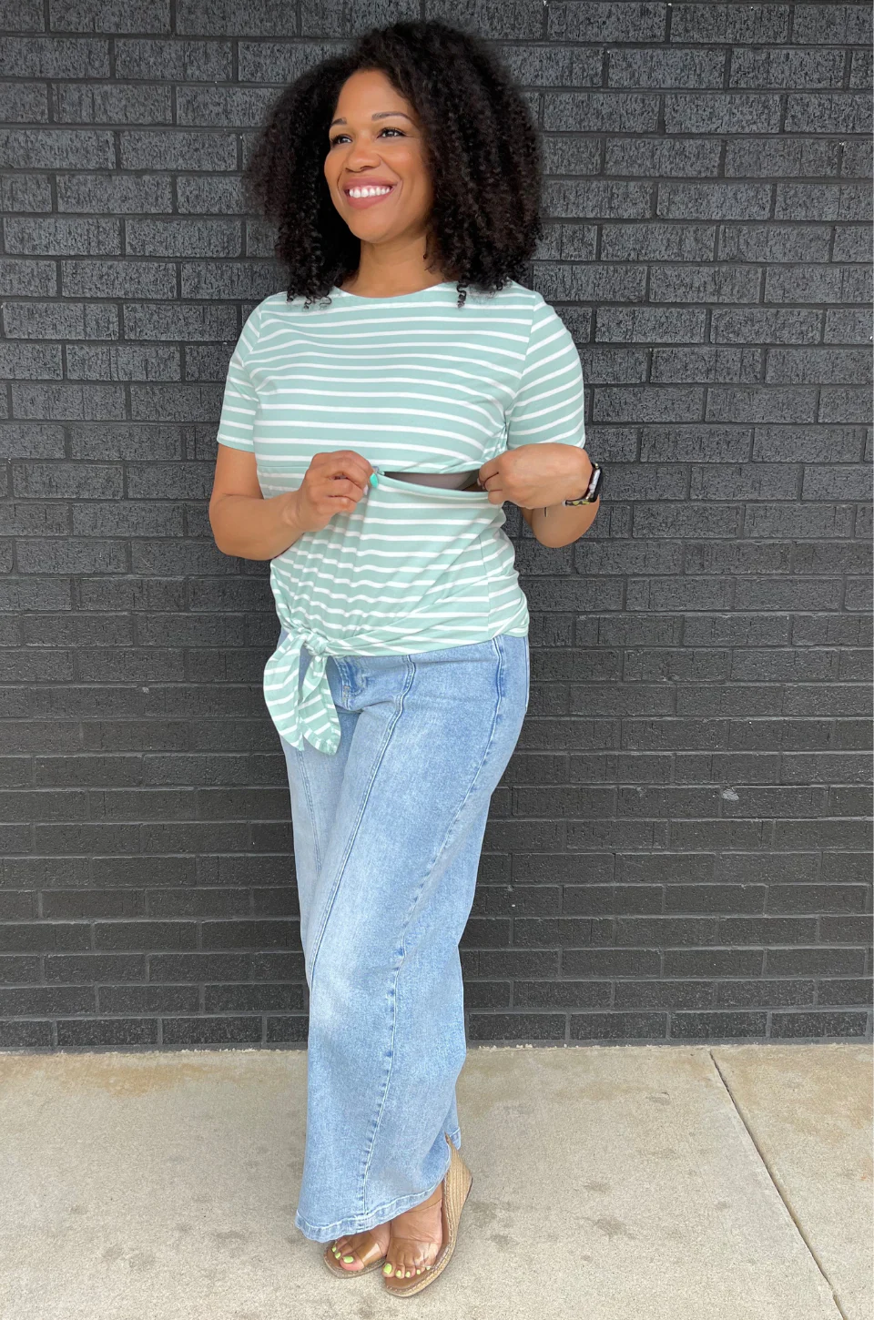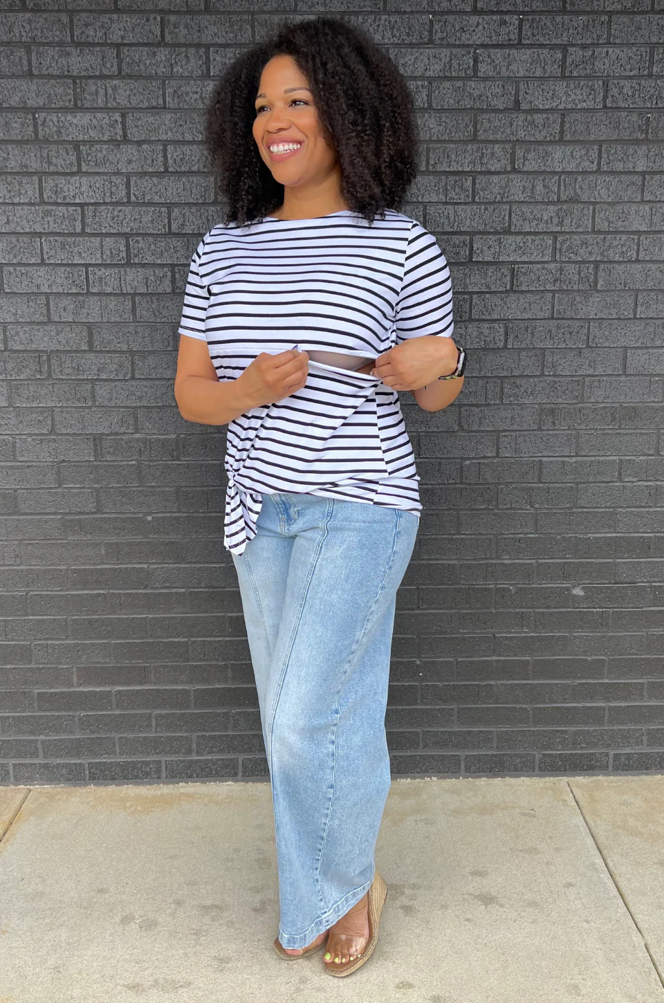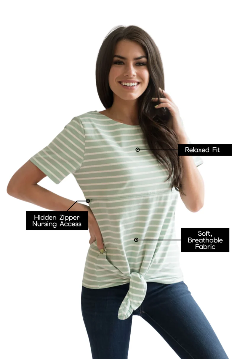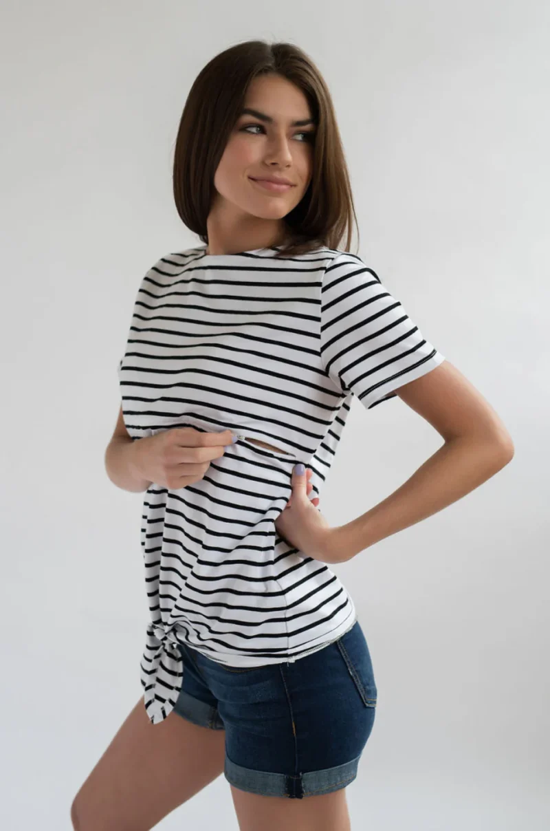 Fresh and easy to wear, this striped nursing t-shirt is designed for breastfeeding moms to nurse or pump easily with discreet hidden zipper access. The front tie detail adds a flattering, casual touch, while the relaxed fit and soft fabric make it perfect for everyday mom life. Designed to look like a regular striped tee, it pairs effortlessly with jeans, shorts, or leggings for an easy, put-together look. We love the cute front tie!