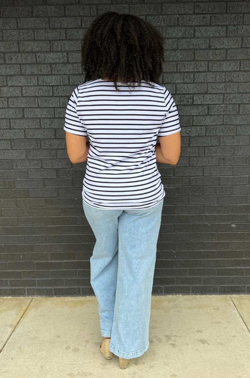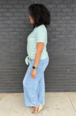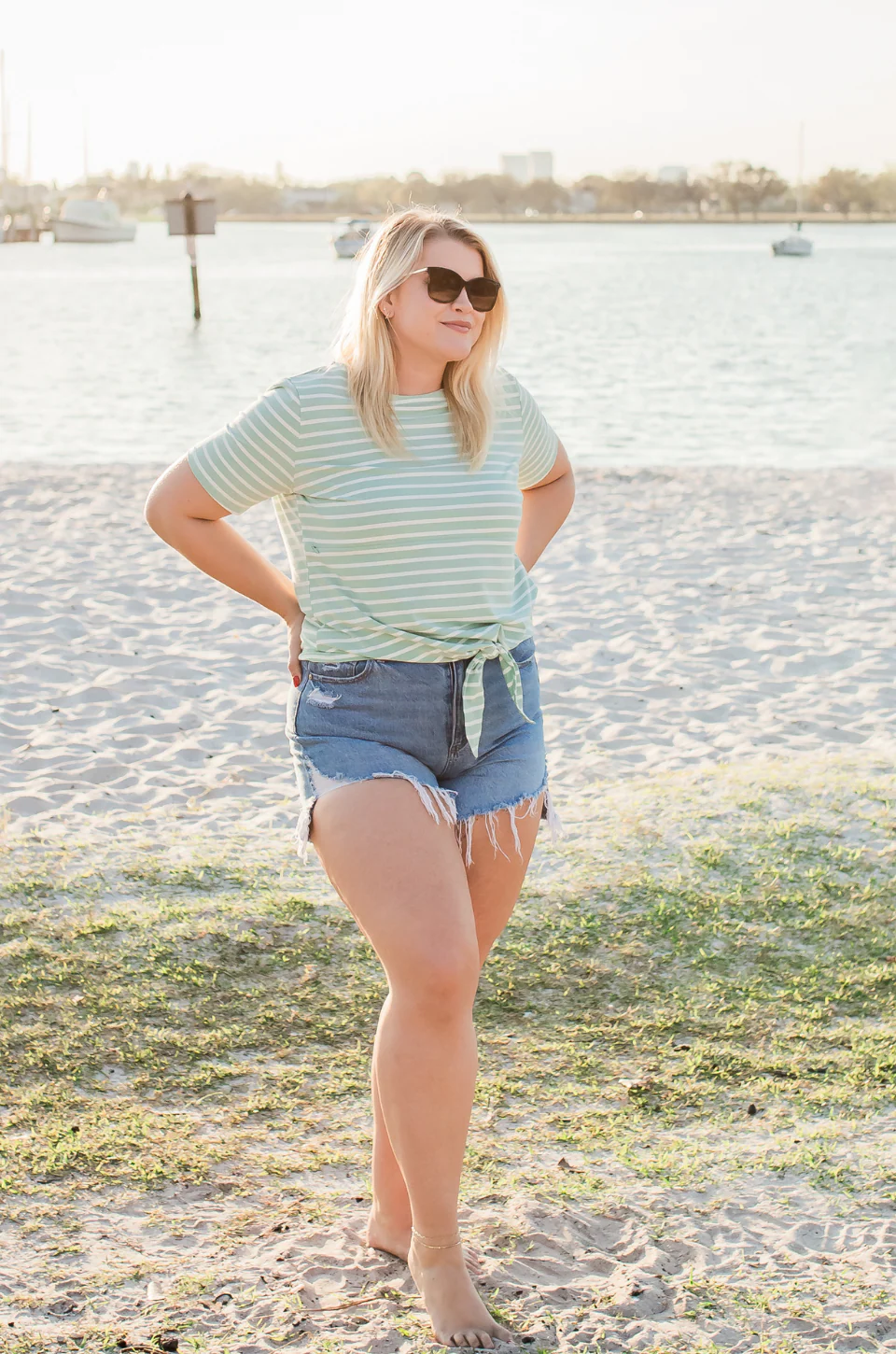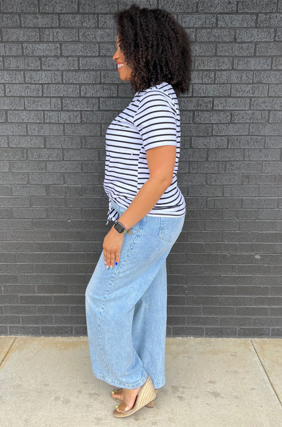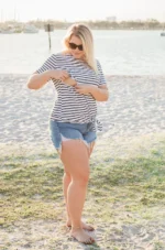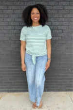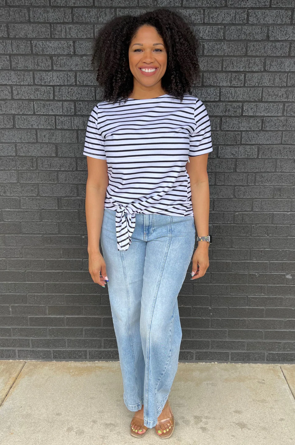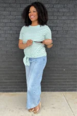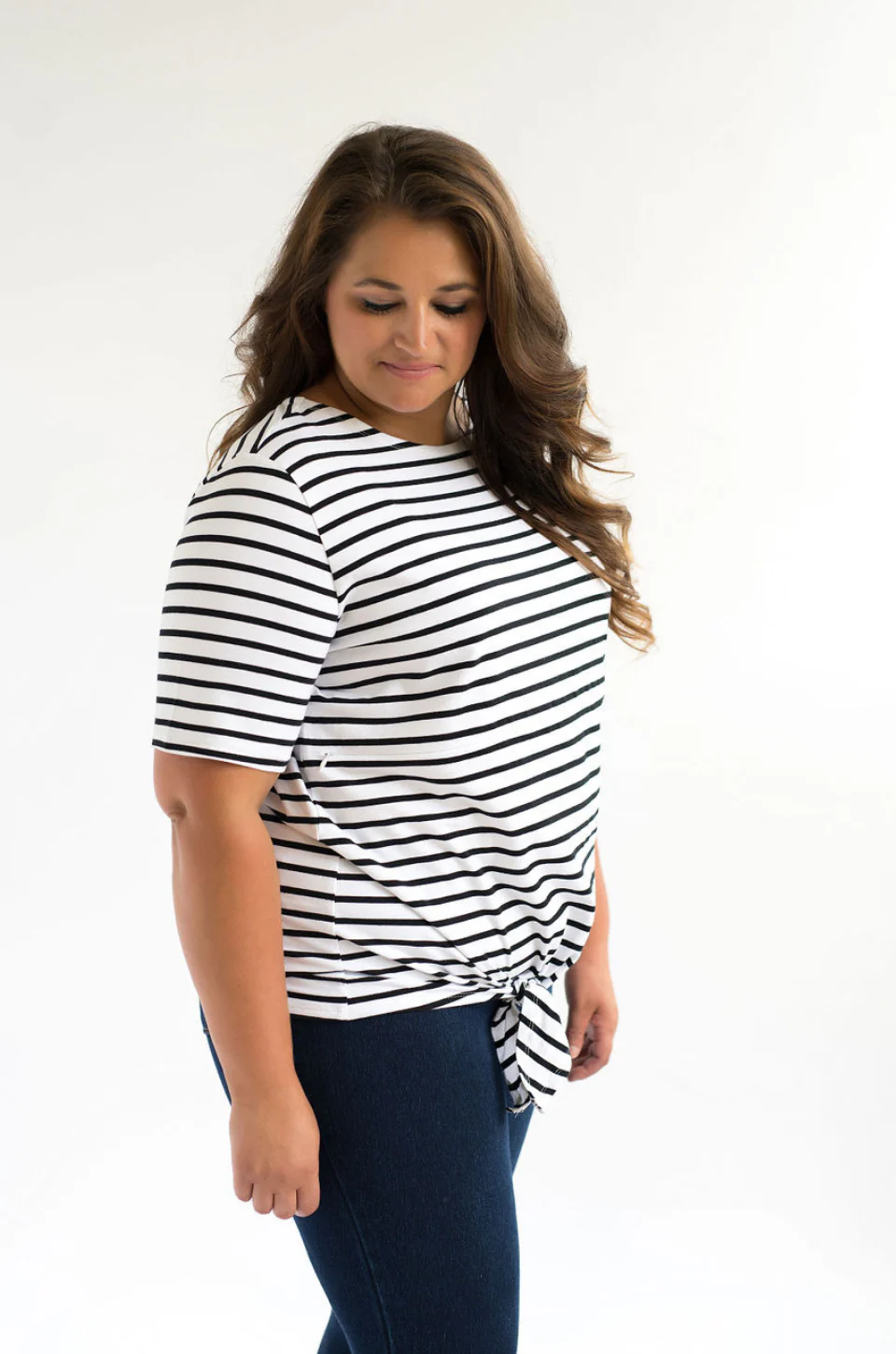 Fresh and easy to wear, this striped nursing t-shirt is designed for breastfeeding moms to nurse or pump easily with discreet hidden zipper access. The front tie detail adds a flattering, casual touch, while the relaxed fit and soft fabric make it perfect for everyday mom life. Designed to look like a regular striped tee, it pairs effortlessly with jeans, shorts, or leggings for an easy, put-together look. We love the cute front tie!