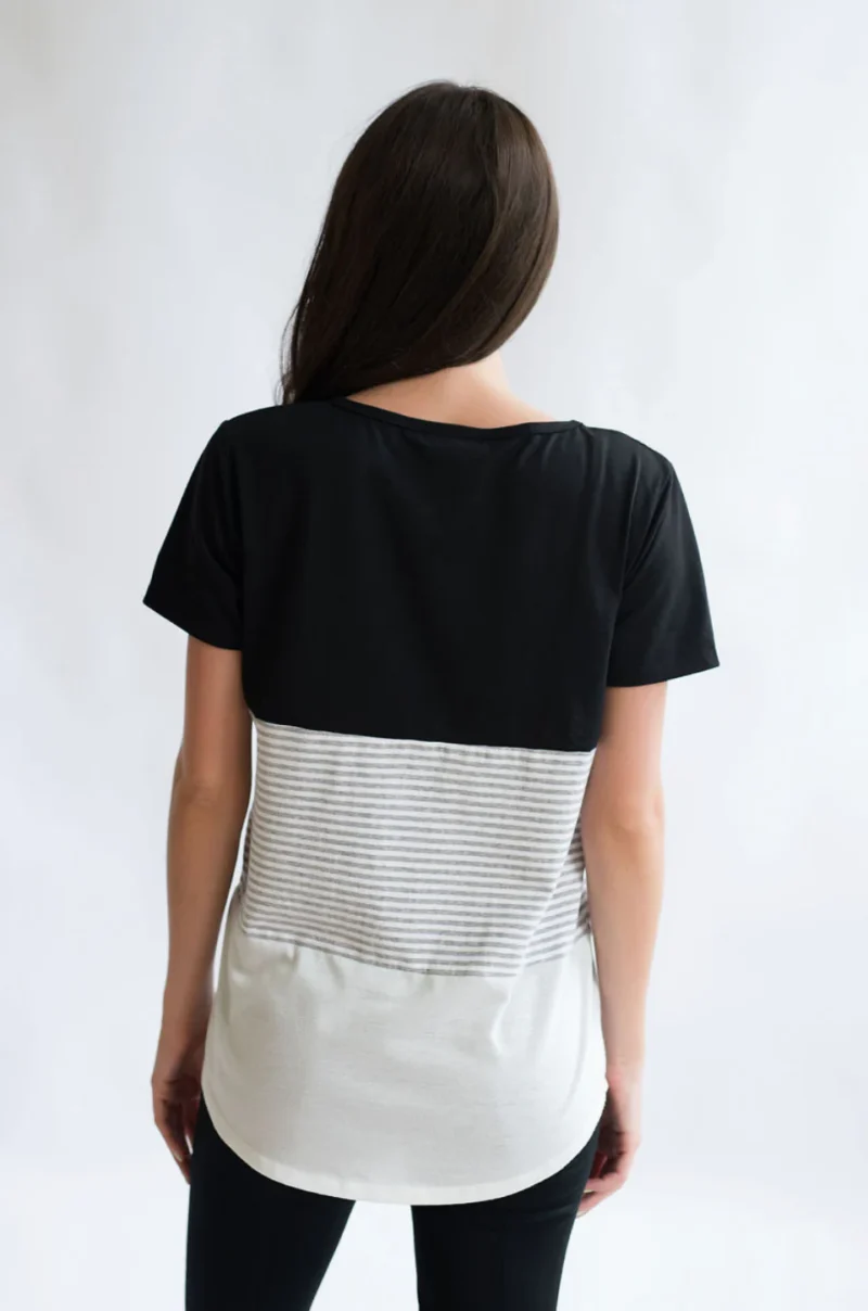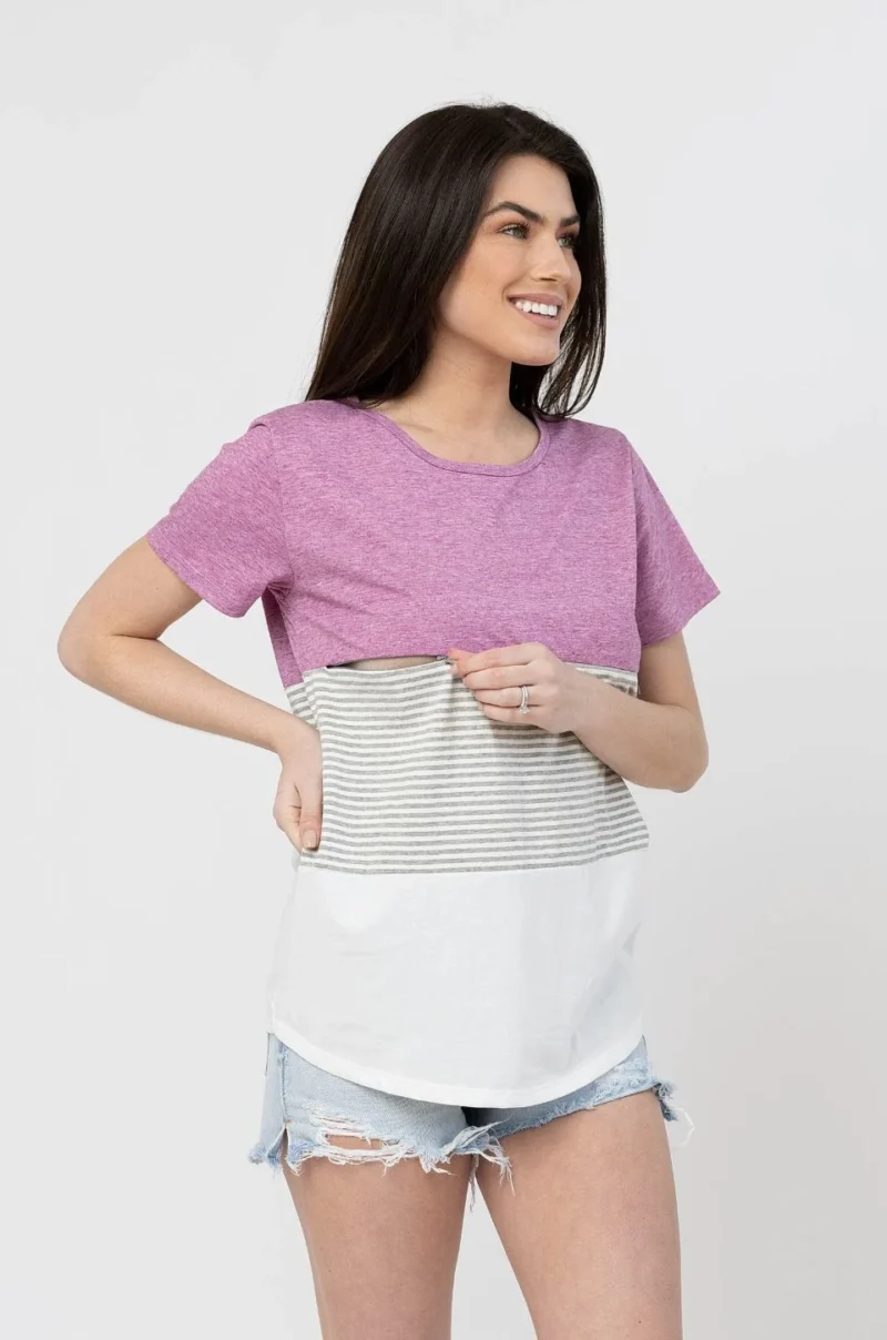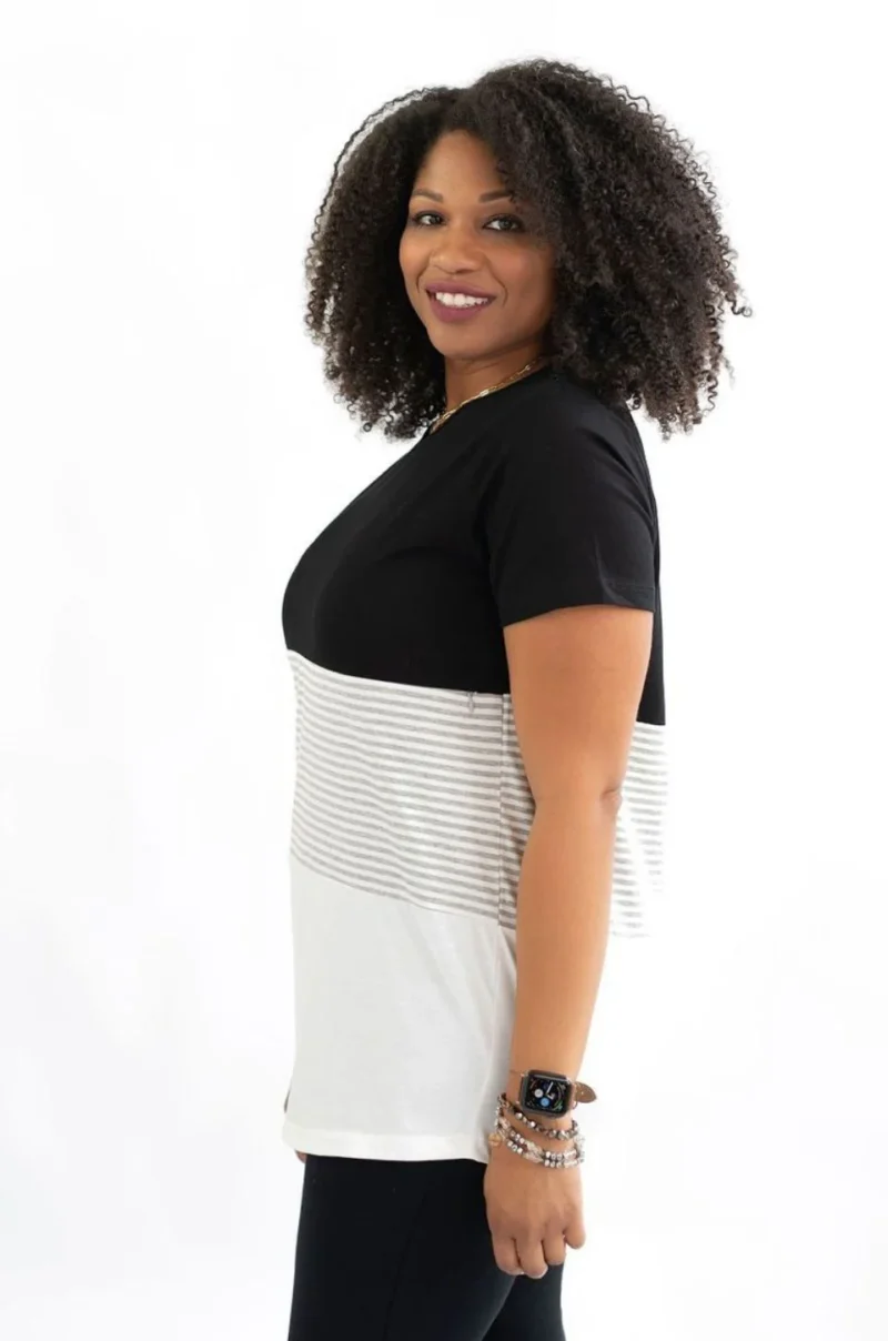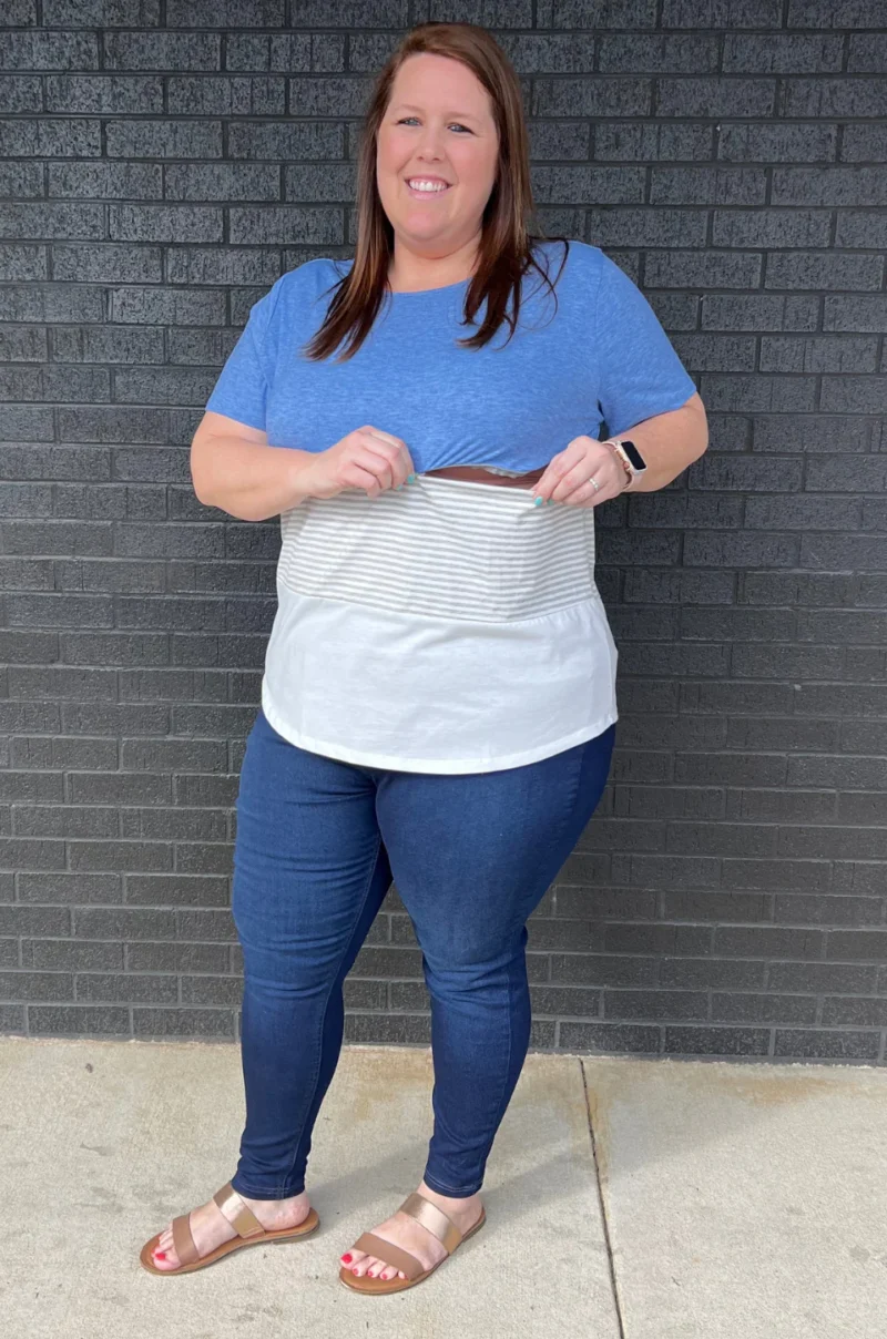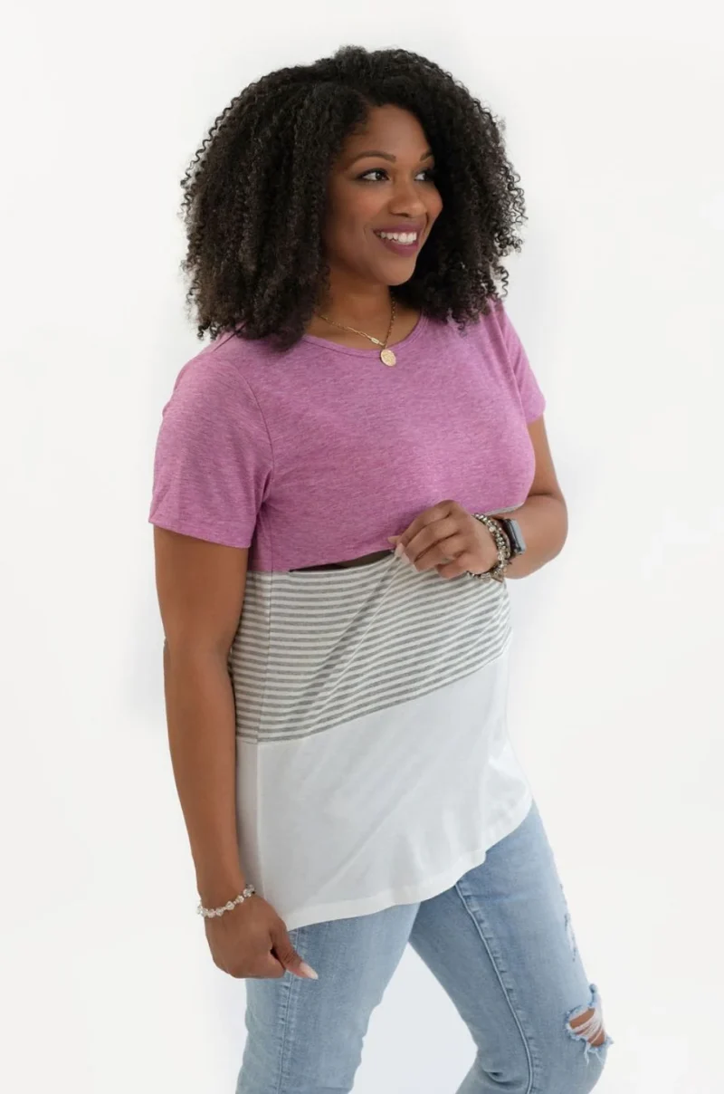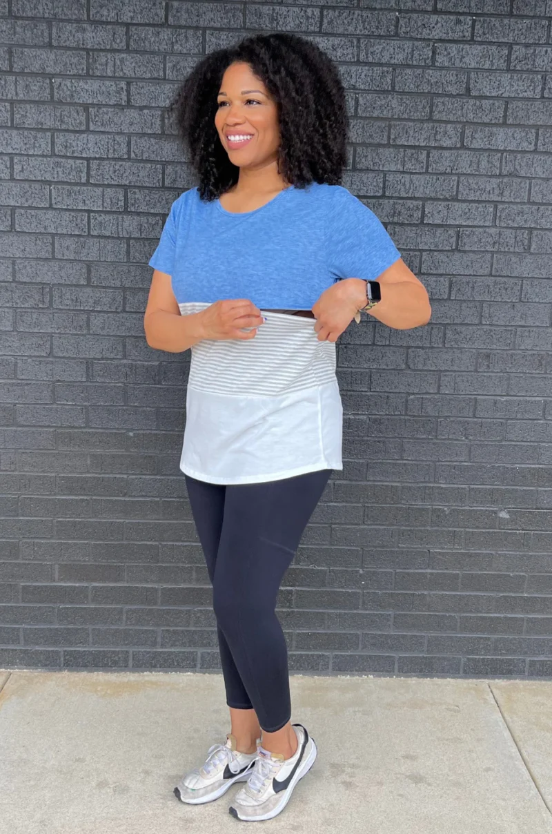 NURSING ACCESS: There’s a hidden zipper along the first colorblock line. This tshirt has one long zipper with pulls on both sides.