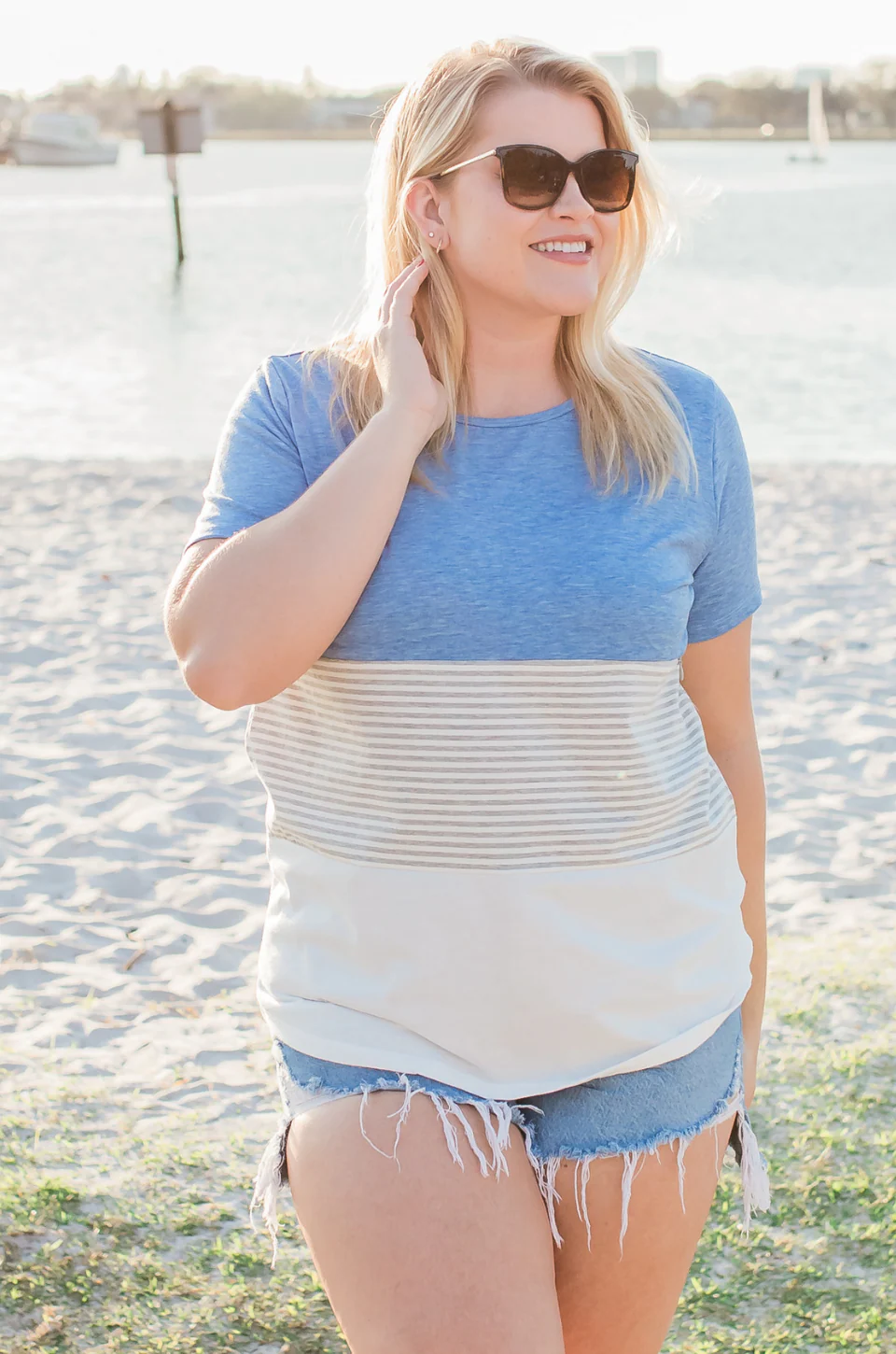 Amanda is 5’8″, size 14, 38D, and is wearing a size L. (Blue and Pink)