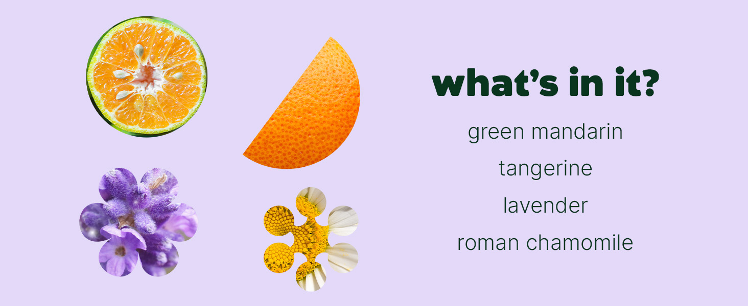 Caprylic/Capric Triglyceride (FCO), Citrus Nobilis (Green Mandarin) Peel Oil, Citrus Reticulata (Tangerine) Peel Oil, Lavandula Angustifolia (Lavender) Oil, Anthemis Nobilis (Roman Chamomile) Flower Oil
