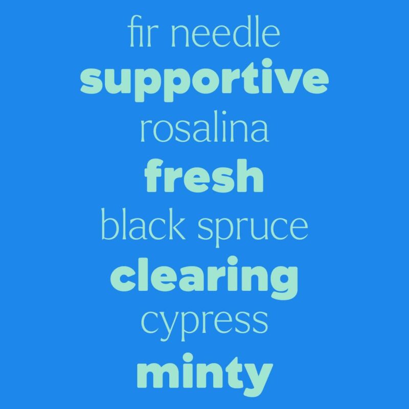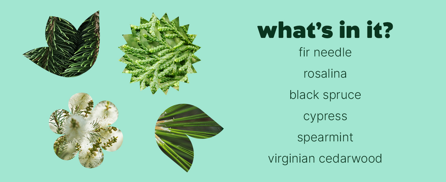 Caprylic/Capric Triglyceride (FCO), Abies Sibirica (Fir) Oil, Melaleuca Ericifolia (Rosalina) Leaf Oil, Picea Mariana (Black Spruce) Leaf Oil, Cupressus Sempervirens (Cypress) Leaf Oil, Mentha Viridis (Spearmint) Leaf Oil, Juniperus Virginiana (Virginian Cedarwood) Oil