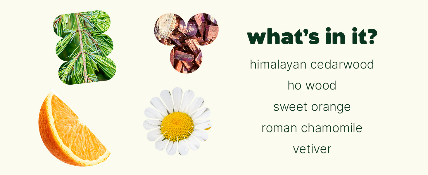 Caprylic/Capric Triglyceride (FCO), Cedrus Deodara (Himalayan Cedarwood) Wood Oil, Cinnamomum Camphora (Ho) Wood Oil, Citrus Aurantium Dulcis (Sweet Orange) Peel Oil, Anthemis Nobilis (Roman Chamomile) Flower Oil, Vetiveria Zizanoides (Vetiver) Root Oil