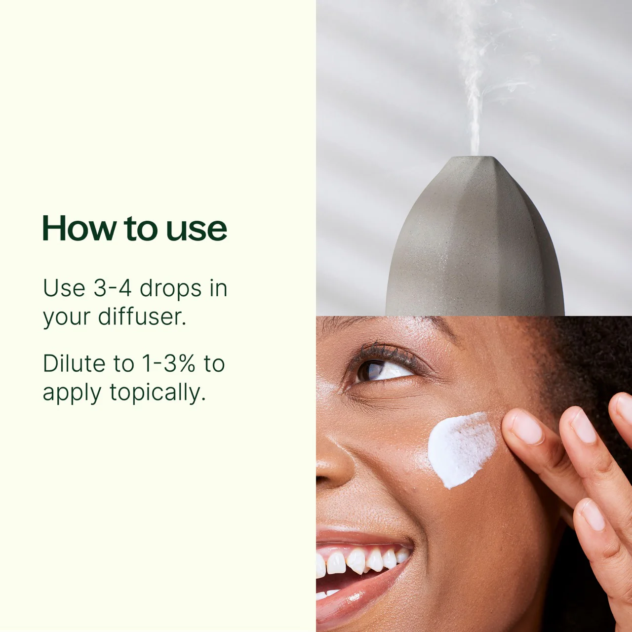 Open the bottle and use as directed by a professional aromatherapist or according to general aromatherapy guidelines. For diffusion, add a few drops to a diffuser and follow the manufacturer’s instructions. For topical use, dilute with a carrier oil before applying to the skin. For inhalation, add a few drops to a personal inhaler or inhale directly from the bottle.