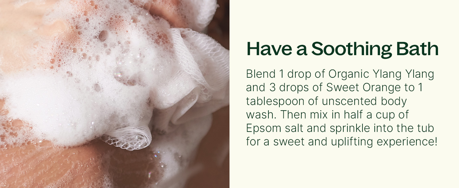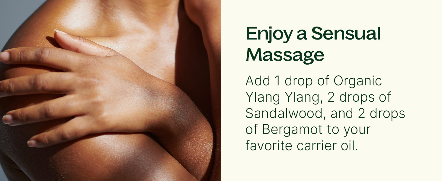 For a sensual massage oil blend, add 1 drop Organic Ylang Ylang Complete, 2 drops Sandalwood, and 2 drops Bergamot in two teaspoons (10 ml) carrier oil. To deep condition your hair, dilute with Fractionated Coconut Oil to 0.8% and massage into roots. And, of course, you can dilute Organic Ylang Ylang Complete and dab on pulse points as a natural perfume.