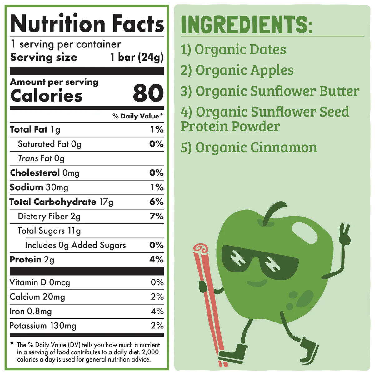 Organic Dates, Organic Apples, Organic Sunflower Butter, Organic Sunflower Seed Protein Powder, Organic Cinnamon.