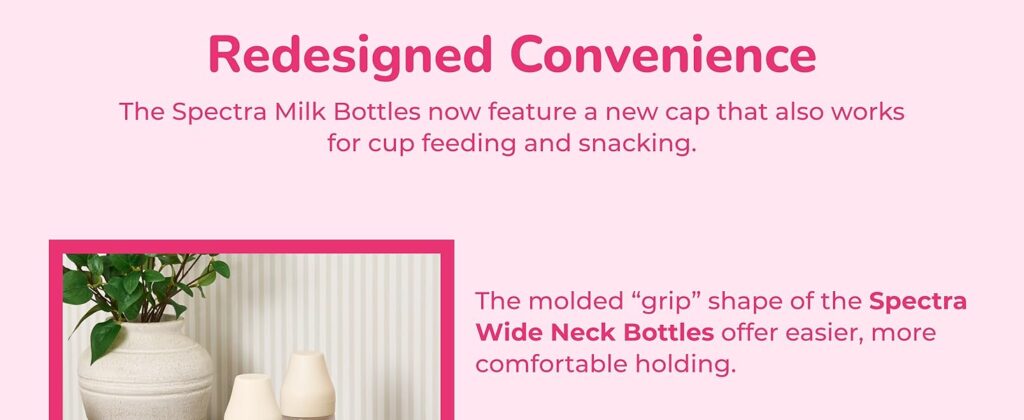 The redesigned Spectra® Milk Bottles feature a new cap that also works for cup feeding and snacking. The molded “grip” shape offers easier, more comfortable holding. With an improved, easy-to-read milk scale and an increased base size for better stability, these bottles prevent tipping over. BPA-free and suitable for fridge or freezer storage, each bottle holds up to 160mL of milk.