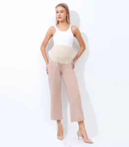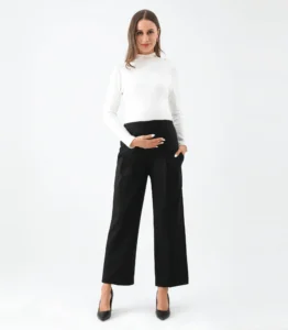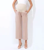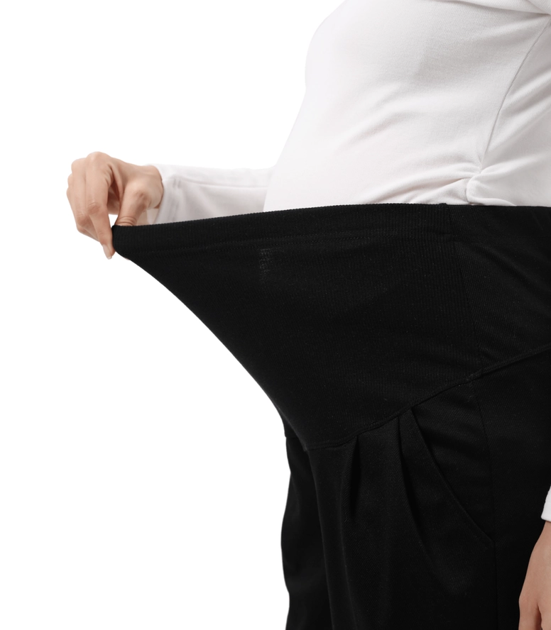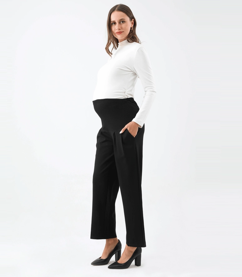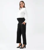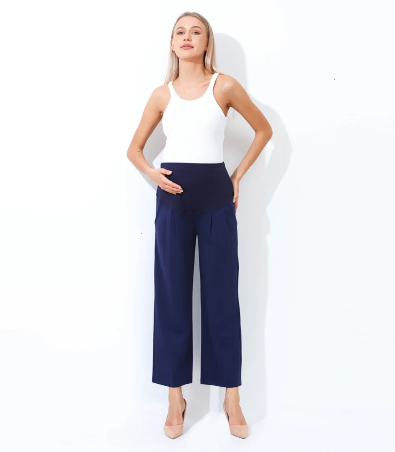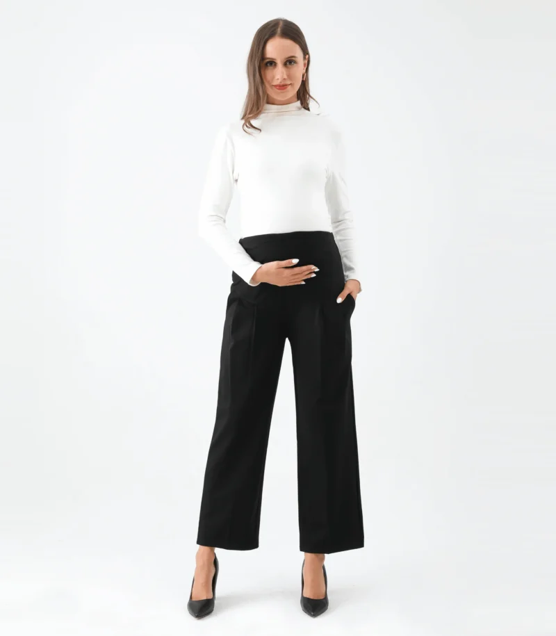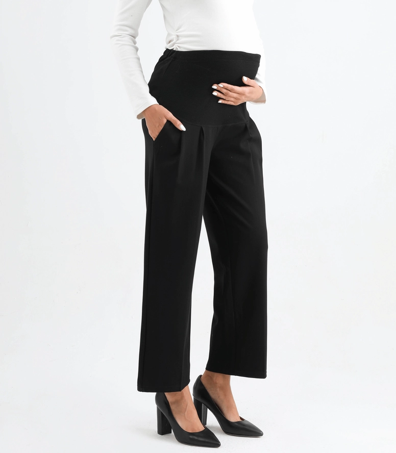 This wide leg ankle length maternity pant is a comfortable and stylish option for pregnant women. Designed to accommodate a growing belly, these pants feature a wide leg silhouette that falls to the ankle and a high waistband that sits above the belly. The waistband is stretchy and elasticized to provide support and comfort during pregnancy. These pants are made from a soft and stretchy fabric that moves with the body, allowing for ease of movement. They can be dressed up with a blouse and heels for a chic office look, or kept casual with a t-shirt and sneakers. The wide leg and ankle length make these pants a flattering choice for any stage of pregnancy, and they can be worn after pregnancy as well! Big practical pockets for your busy life.